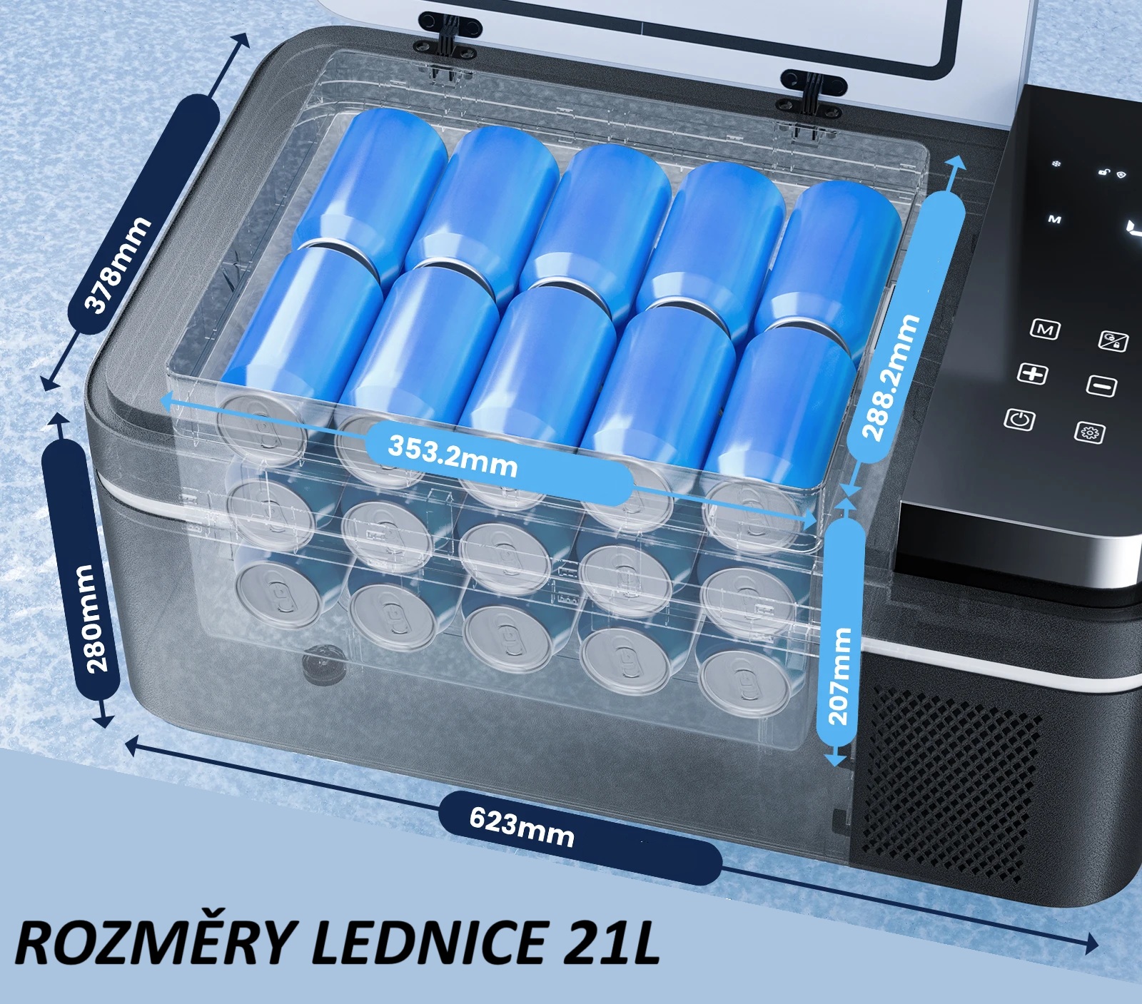 - Autochladnička kompresorová, autolednice, objem 21l, napájení 12V, 24V nebo 230V, LCD displej, vnitřní osvětlení
