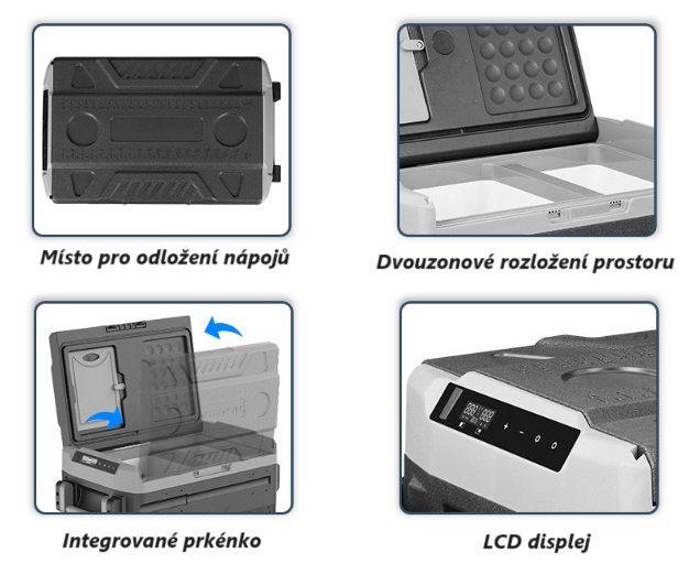 - Autochladnička kompresorová dvouzonová, autolednice, objem 40l, napájení 12V, 24V nebo 230V, LCD displej, bluetooth aplikace, šedá