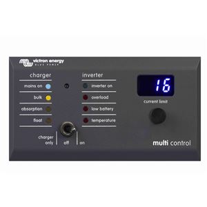 Panel pro vzdálené ovládání a sledování měničů/nabíječek řady MultiPlus a Quattro a to v samostatném, paralelním i třífázovém povozu. Umožňuje páčkovým spínačem vzdáleně zapínat a vypínat připojené zařízení , případně volit režim „pouze nabíječka“. Dále umožňuje měnit hodnotu maximálního vstupního proudu ze sítě nebo jiného zdroje střídavého proudu. Nastavená hodnota se trvale zobrazuje na digitálním displeji. Panel zobrazuje pomocí LED diod provozní stav. Nalevo se zobrazuje zapnutí/vypnutí měniče, přetížení spotřebiči, nízký stav nabití akumulátorů a vysoké teploty zařízení. Napravo se zobrazuje napojení na síť (generátor) a fáze nabíjení akumulátorů. Propojení s ovládaným zařízením je pomocí UTP kabelu s koncovkami RJ45 (není součástí dodávky). Panel je určen pro vsazení do zdi, elektrokrabice a podobně. Panel má tlačítko konfigurace pro individuální nastavení. Další informace v návodu níže.