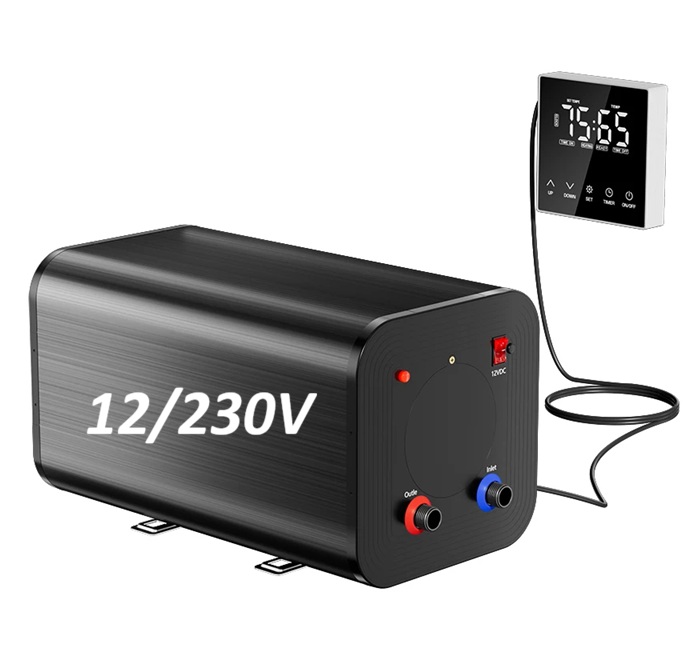 - Elektrický nerezový bojler pro karavany 10 litrů s přepínatelným výkonem a napětím 12V/220W a 230V/1600W včetně vzdáleného displeje pro nastavení bojleru