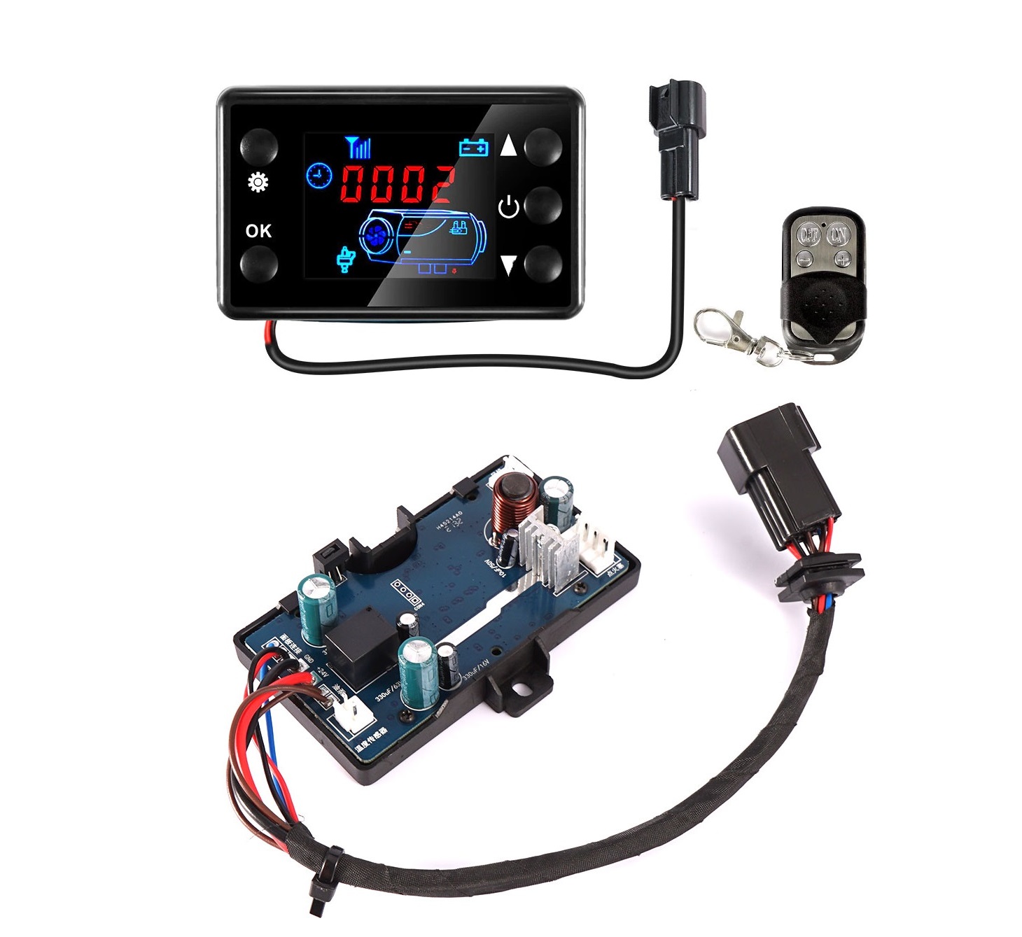 - Instalační sada pro přechod na černý ovládací displej, pro topení 12V (2-8kW), řídící jednotka 12V, ovládací displej, dálkový ovladač