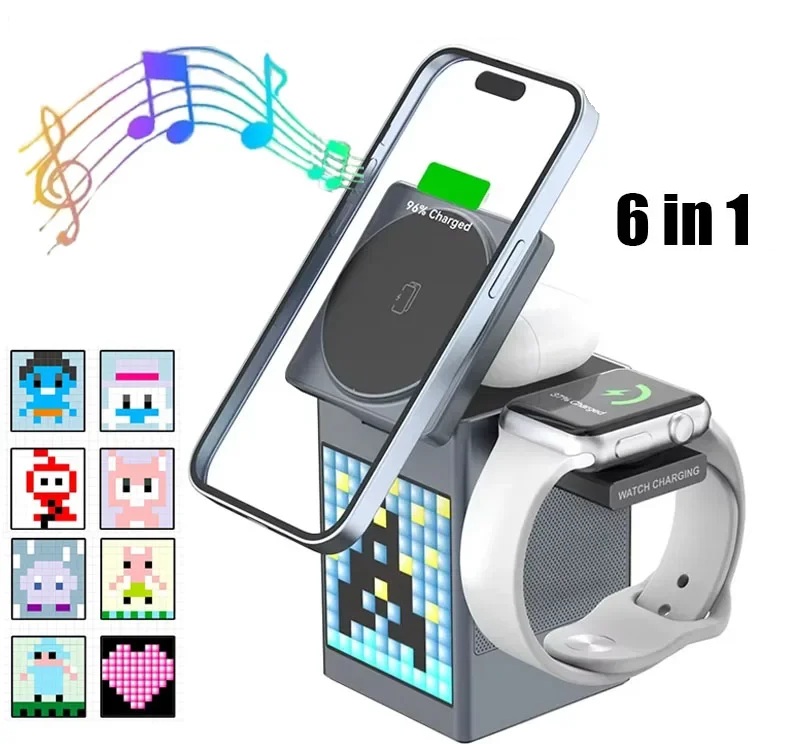 Multifunkční magnetická stanice 6 v 1: MagSafe nabíječka, Bluetooth reproduktor a budík 🔋🎵⏰