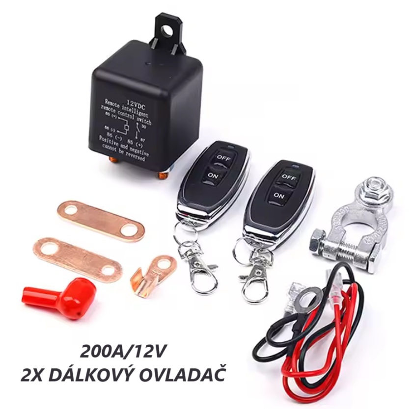 - Relé pro spínání baterie 12V/200A, 2x dálkové ovládání