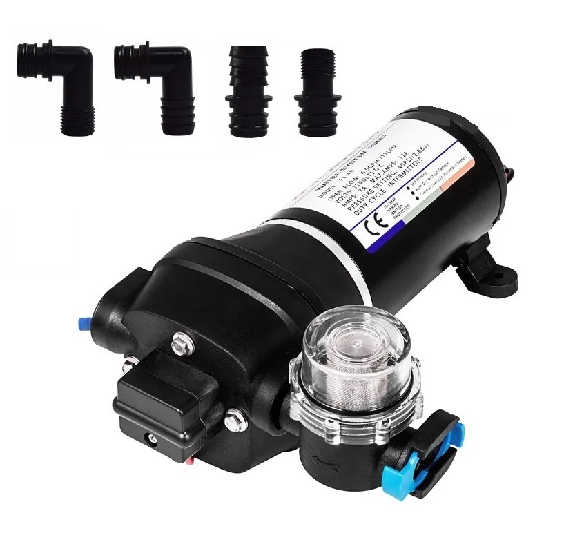 Membránové čerpadlo vhodné pro rozvody vody v karavanech, obytných vozech nebo na lodích, na chatě nebo chalupě a dalších podobných místech. Výkon čerpadla je 17l/min, tlak čerpadla je 40PSI a 2,8baru. Čerpadlo je napájeno 12V DC. Lze jej tedy provozovat z 12V bateriích všech typů, dále pak je možné čerpadlo připojit k síti 230V prostřednictvím transformátoru 12V (minimum je 15A). Transformátor není součástí balení.