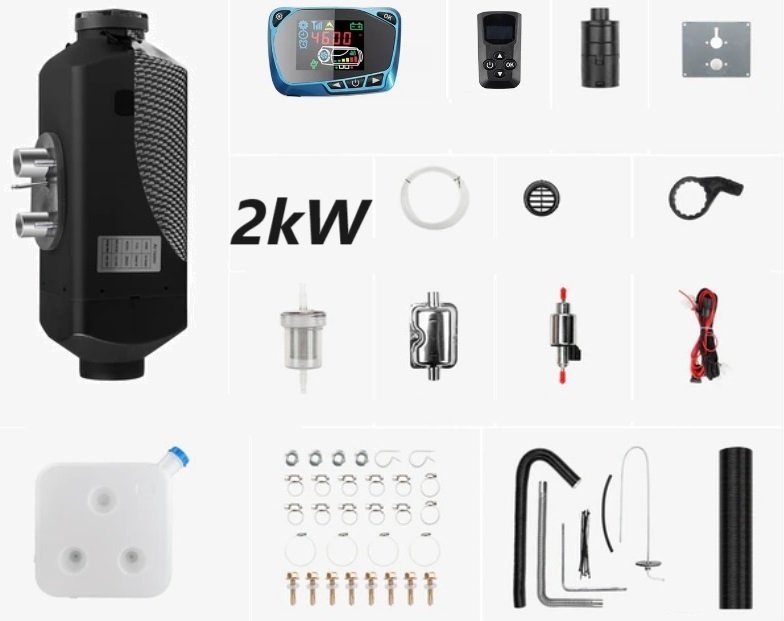 Horkovzdušné topení o výkonu 2kW. Topení je určeno primárně do osobních a nákladních automobilů, bagrů, traktorů, lodí a do obytných automobilů. Díky velkému výkonu není problém vytopit i menší místnost nebo garáž. Cena je včetně kompletní instalační sady. V chladnějších měsících při použití topení není potřeba škrábat okna a interiér vozidla je příjemně vyhřátý. Topení dobře pracuje i v obytném vozidle kde např. na horách dokáže dlouhodobě udržet nastavenou teplotu. Teplota se nastavuje na termostatu, který je součástí balení. Spouštění se provádí sepnutím tlačítka na termostatu nebo dálkovým ovladačem, který má dosah cca 30m.
