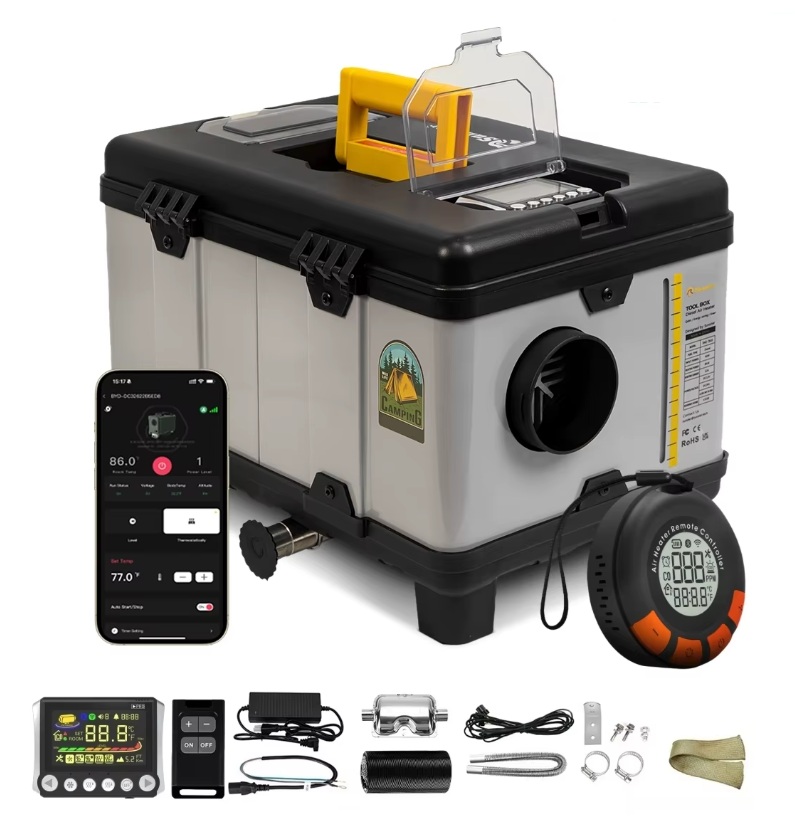 Přenosné horkovzdušné topení o výkonu 8kW Topení je určeno primárně do osobních a nákladních automobilů, bagrů, traktorů, lodí a do obytných automobilů. Díky velkému výkonu není problém vytopit i menší místnost nebo garáž. Cena je včetně kompletní instalační sady. V chladnějších měsících při použití topení není potřeba škrábat okna a interiér vozidla je příjemně vyhřátý. Topení dobře pracuje i v obytném vozidle kde např. na horách dokáže dlouhodobě udržet nastavenou teplotu. Teplota se nastavuje na termostatu, který je součástí balení. Spouštění se provádí sepnutím tlačítka na termostatu nebo dálkovým ovladačem, který má dosah cca 30m.